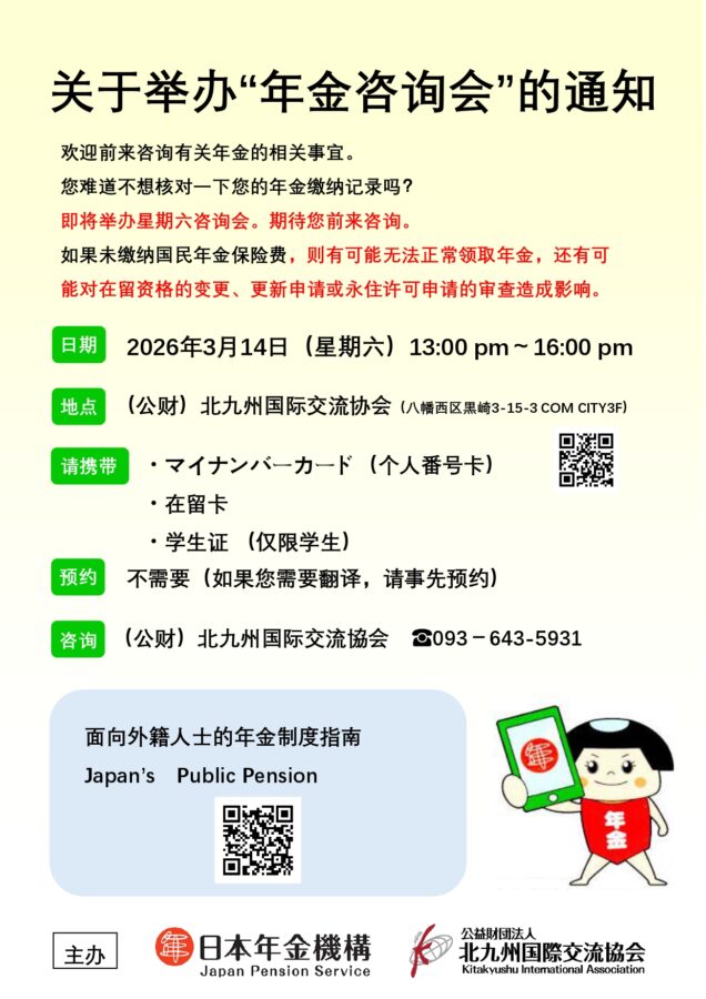2026.01.23 通知 关于举办“年金咨询会”的通知 您可以咨询关于年金的相关事宜。您难道不想核对一下您的年金记录吗? ■日期:2026年2月14日(星期六)10:00 am~15:00 pm■地点:(公财)北九州国际交流協会(八幡西区黒崎3-15-3 COMCITY 3F)■携带物品:・个人番号卡 ・在留卡 ・学生証证(仅限学生)■预约:不需要(如果您需要翻译,请事先预约)■咨询:(公财)北九州国际交流協会 ☎093-643-5931 年金相談会 宣传单下载