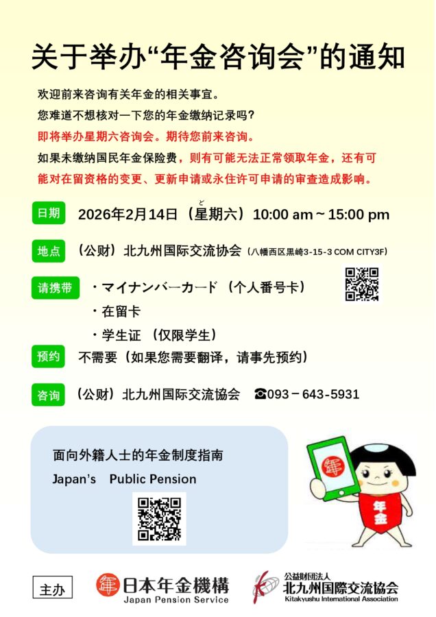 2026.01.23 通知 关于举办“年金咨询会”的通知 您可以咨询关于年金的相关事宜。您难道不想核对一下您的年金记录吗? ■日期:2026年2月14日(星期六)10:00 am~15:00 pm■地点:(公财)北九州国际交流協会(八幡西区黒崎3-15-3 COMCITY 3F)■携带物品:・个人番号卡 ・在留卡 ・学生証证(仅限学生)■预约:不需要(如果您需要翻译,请事先预约)■咨询:(公财)北九州国际交流協会 ☎093-643-5931 年金相談会 宣传单下载