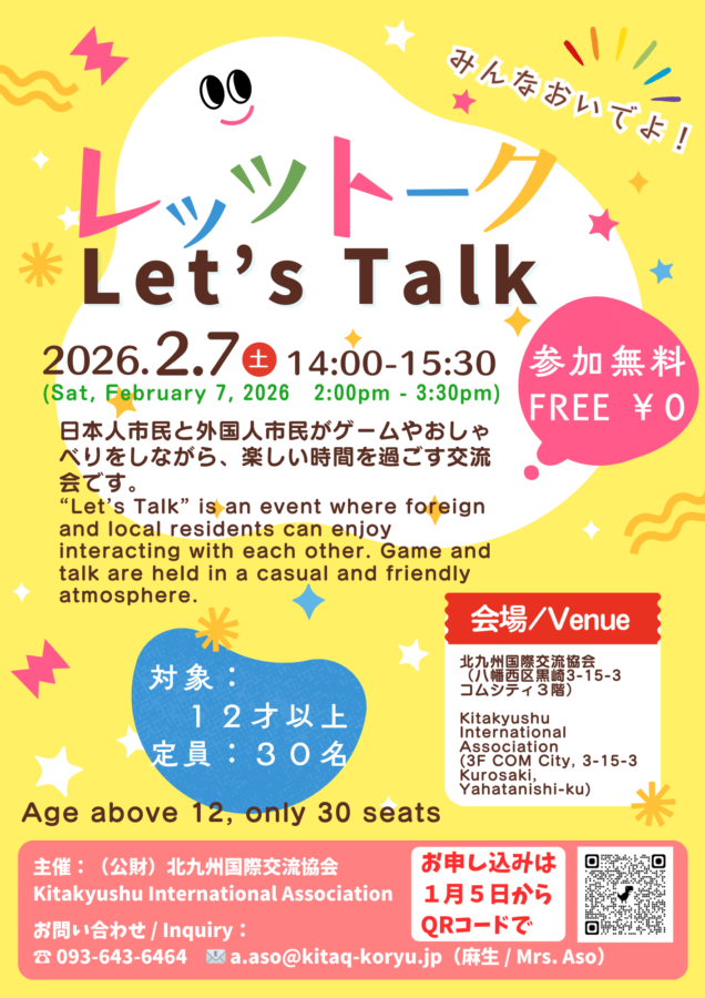 Place:Kitakyushu International Association(3F Com City, 3-15-3 Kurosaki, Yahatanishi-ku)