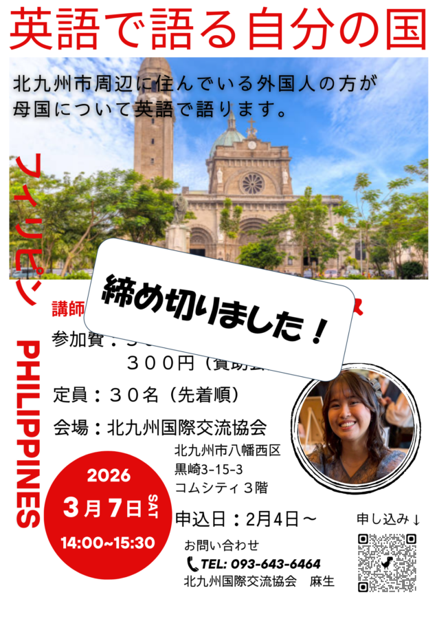 北九州市周辺に住んでいる外国人の方が講師となり、母国について英語で語る講座です。さまざまな国の文化や生活を、