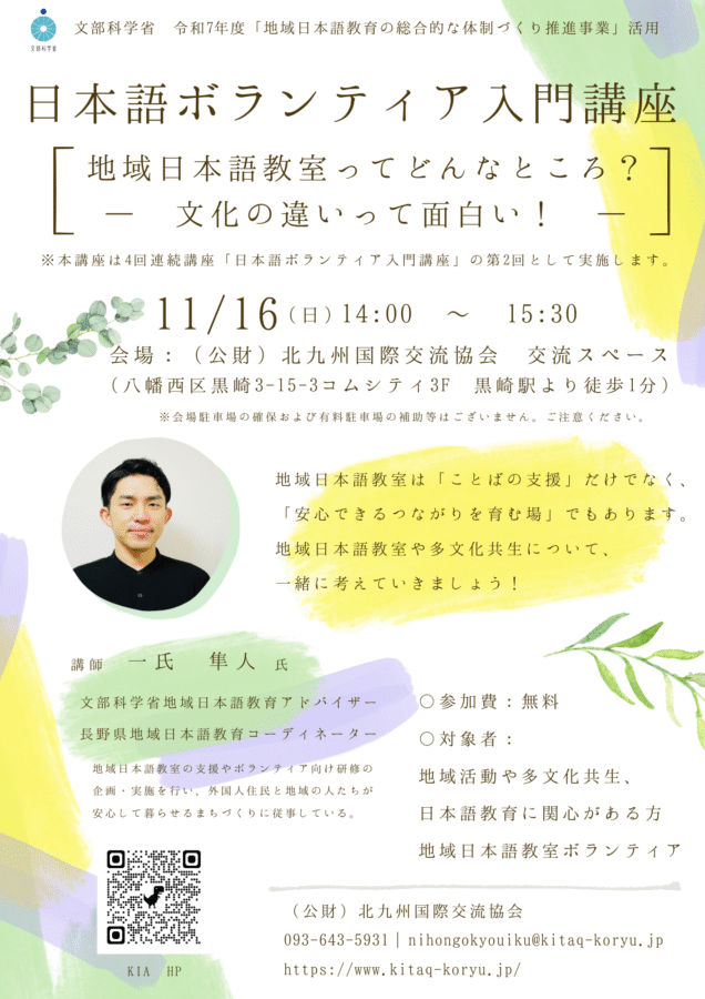 内容 | 北九州市内には16の地域日本語教室があり(令和7年4月時点)、地域で暮らす外国人住民との交流・学びの場となっています。やさしい日本語や地域日本語教室の役割等について実際に活動されている方からお話を聞き学びを深めていきます。日本語を使ったボランティア活動を通じて多文化共生の最前線へ飛び込んでみませんか? |