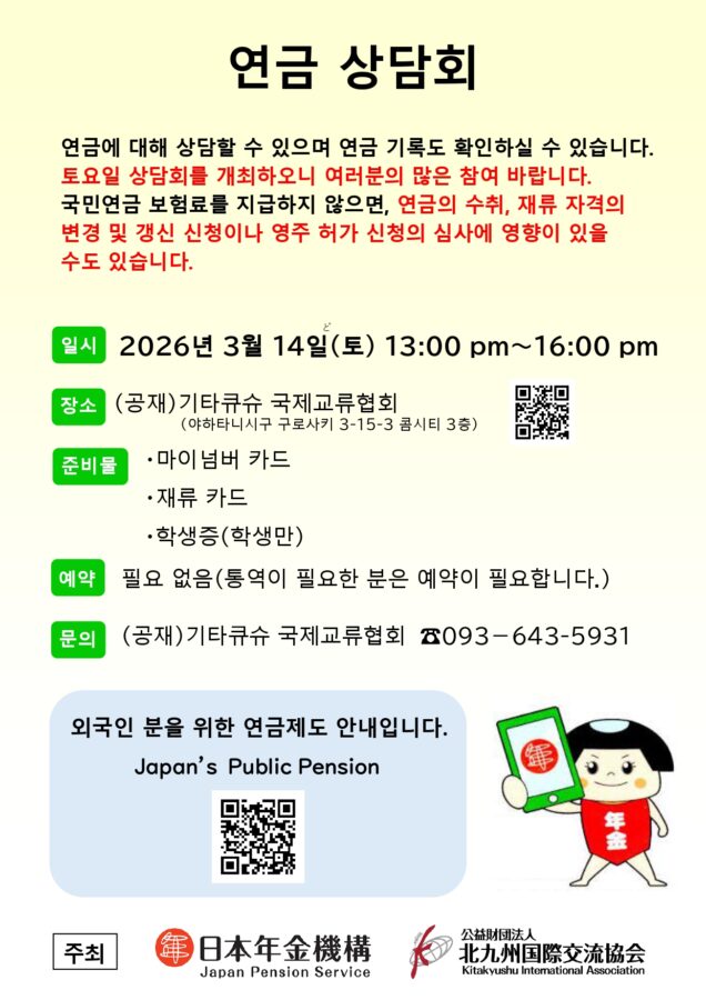 2026.01.21 공지 연금 상담회를 개최합니다 연금에 대해 상담할 수 있으며 연금 기록도 확인하실 수 있습니다. ■일시:2026년 3월 14일(토) 13:00 am~16:00 pm■장소:(공재)기타큐슈 국제교류협회(야하타니시구 구로사키 3-15-3 콤시티 3층)■준비물:・마이넘버 카드・재류 카드・학생증(학생만)■예약:필요 없음(통역이 필요한 분은 예약이 필요합니다.)■문의:(공재)기타큐슈 국제교류협회 ☎093-643-5931 연금 상담회 전단다운로드