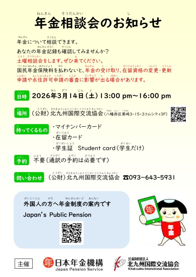 2026.02.25 お知らせ 年金相談会のお知らせ 年金について相談できます。あなたの年金記録も確認してみませんか? ■日時:2026年3月14日(土)13:00 pm~16:00 pm■場所:(公財)北九州国際交流協会(八幡西区黒崎3-15-3コムシティ3F)■持ってくるもの:・マイナンバーカード ・在留カード ・学生証 Student card(学生だけ)■予約:不要(通訳の予約は必要です)■問い合わせ:(公財)北九州国際交流協会 ☎093-643-5931 年金相談会チラシダウンロード